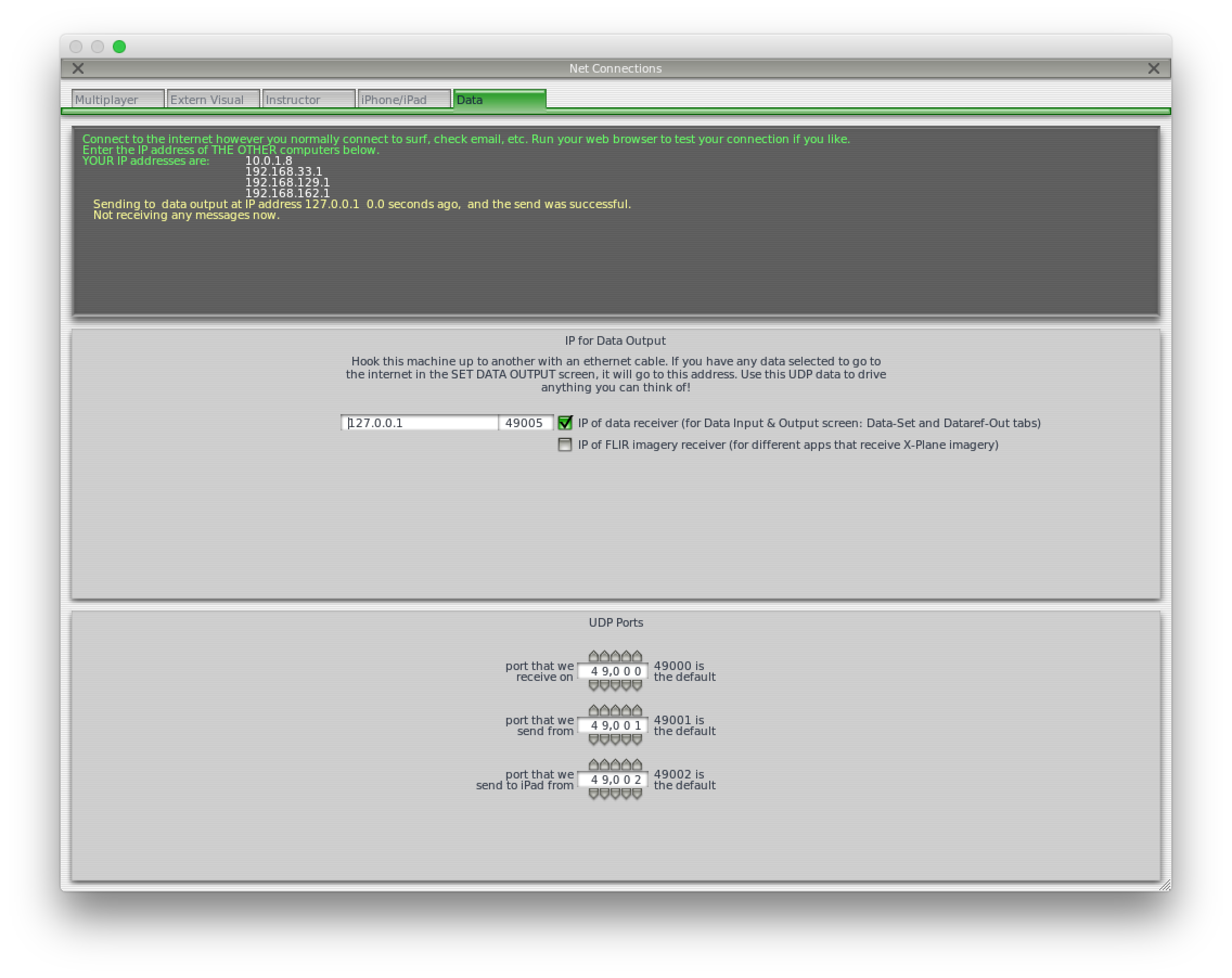 In X-Plane two key settings have to be made: In Settings -> Data Input and Output, set these checkboxes: